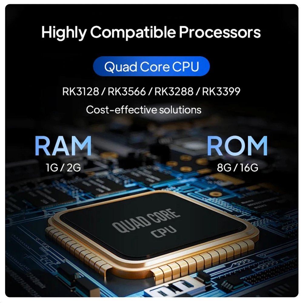 - RK3566 (Quad-core 1.8GHz) ou RK3399 (Dual-core A72 + Quad-core A53) para desempenho ágil e contínuo.