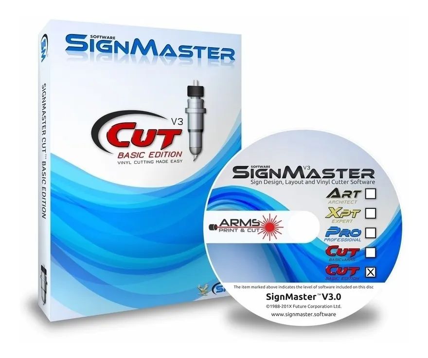 SignMaster BASIC (CUT) é para corte de vinil simples e permite que você produza letras, logotipos e faixas de vinil. SignMaster CUT vem com um conjunto básico de ferramentas de texto, curva e objeto e suporta cortadores de vinil com ponteiro laser para corte manual de contorno.